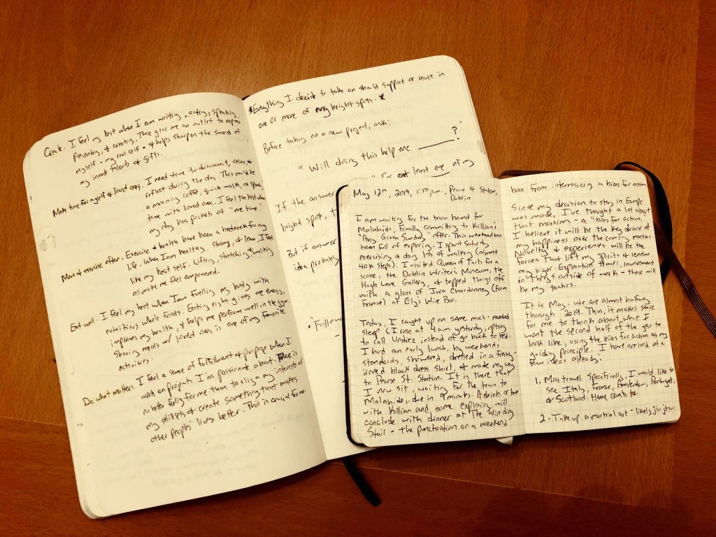 2. To the extent that you can, check in with yourself every month or so. Document what you’ve done, where you’ve been, who you’re engaging with, and – most importantly – how you’re feeling. I’ve learned that human beings can be total shit at making good decisions in the moment. If you have a ledger of how your life is trending, it can help inform a more objective decision.